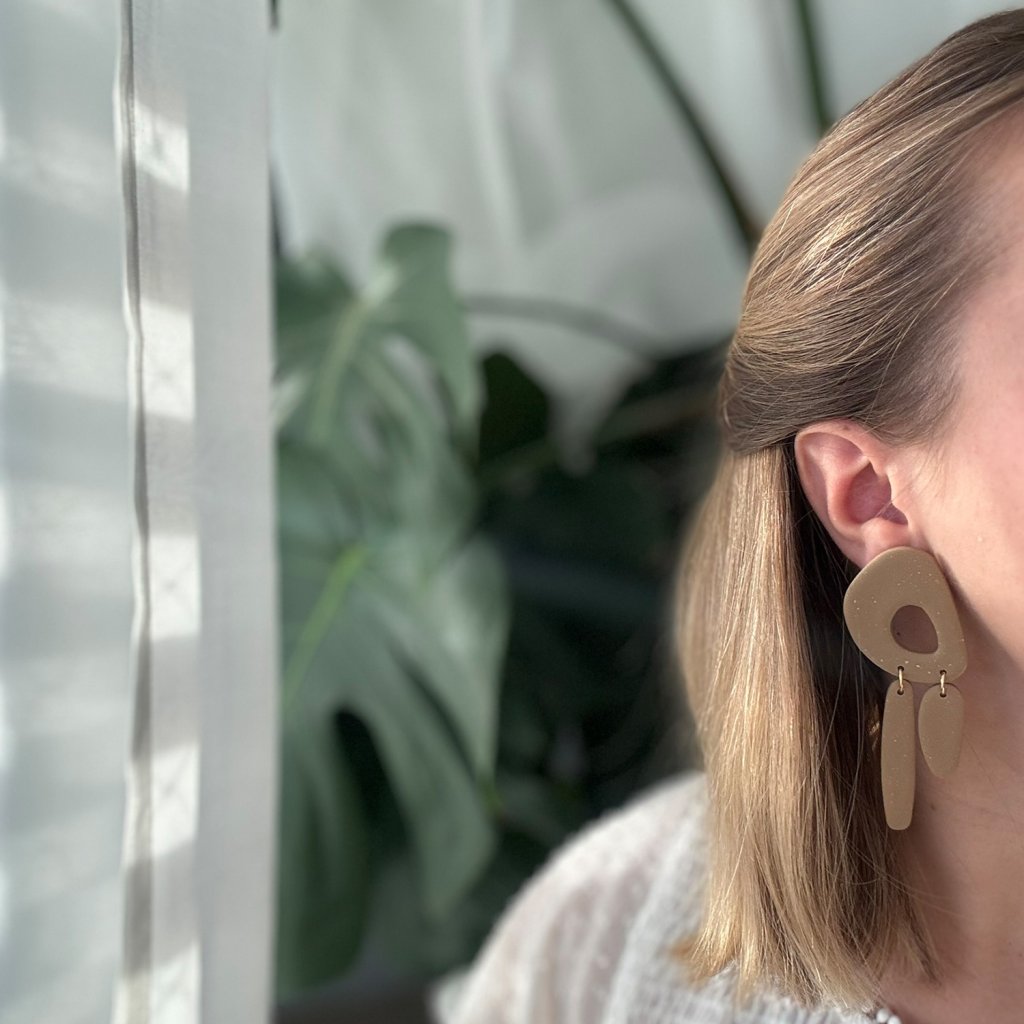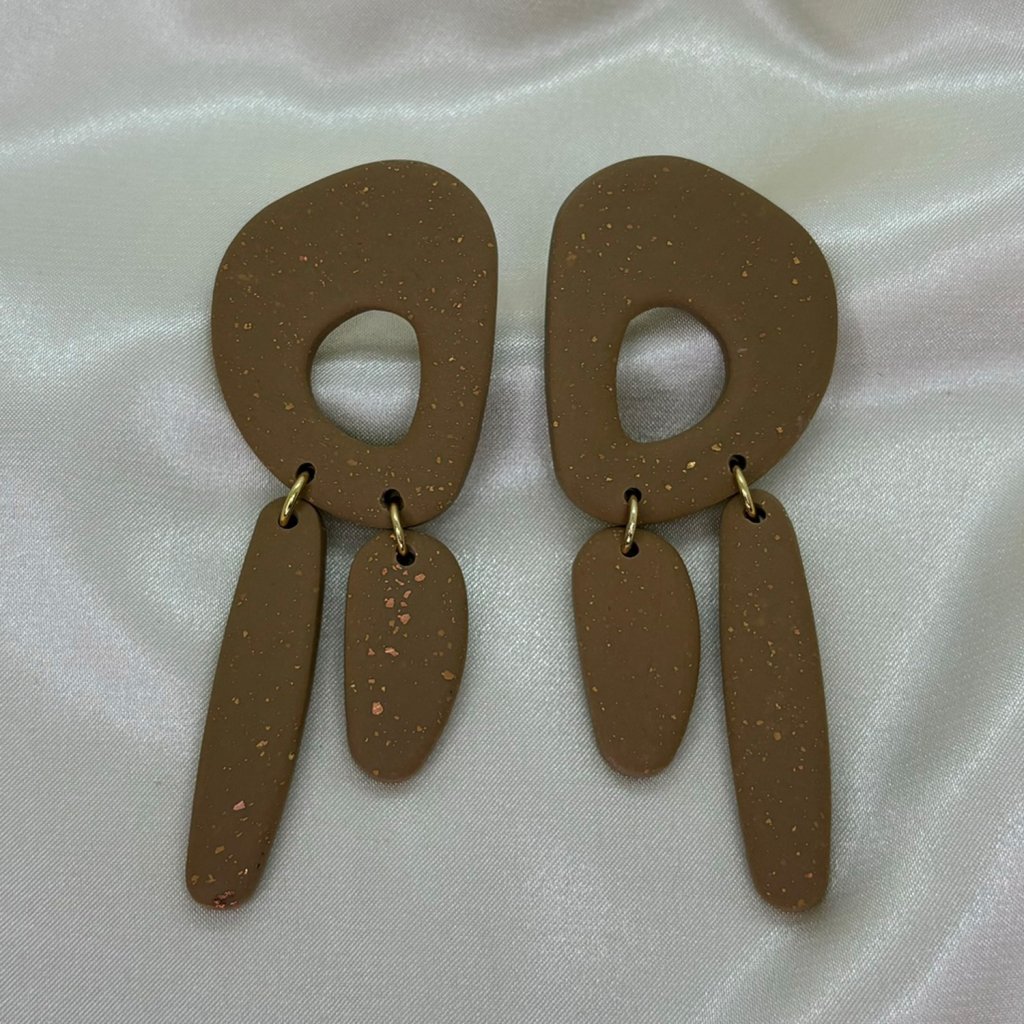 Asymetrické, organické tvary dodávajú náušniciam jedinečný charakter. Hnedý odtieň so zlatistými bodkami pridáva jemný detail, ktorý náušnice ozvláštňuje a robí ich elegantnými. Vďaka pohyblivým visiacim prvkom pôsobia dynamicky a výborne doplnia akýkoľvek outfit.