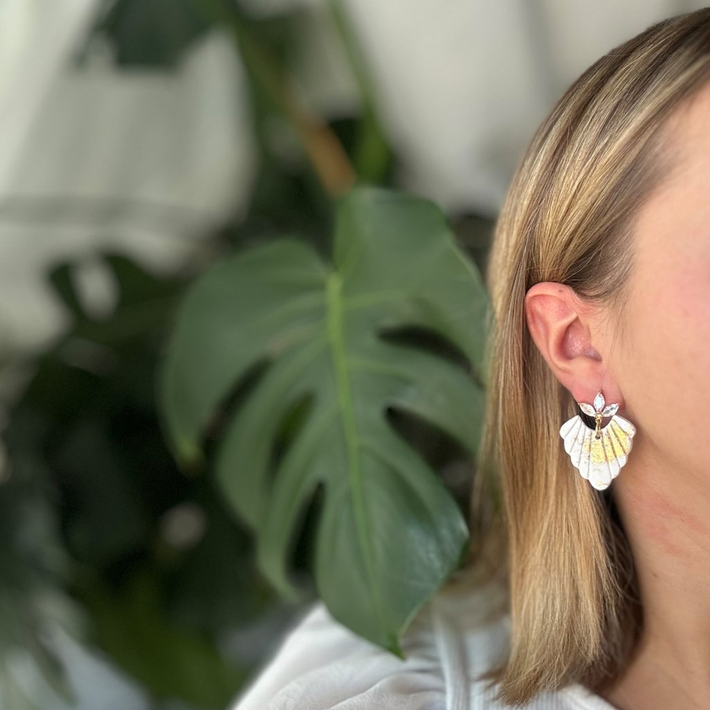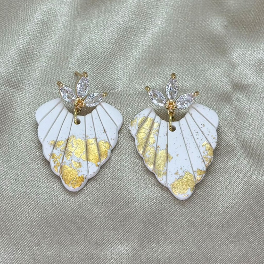 Dizajn náušníc pôsobí moderne a elegantne. Biela farba v spojení so zlatými metalickými plátkami dodáva náušniciam luxusný a jedinečný vzhľad. Vrchná časť náušníc je spojením zirkónu a 14K pozlátením v tvare kvietku a pridáva náušniciam na exkluzivite a zaručuje, že náušnice budú pútať pozornosť. Sú ideálne na špeciálne príležitosti, ale aj na doladenie elegantného outfitu.