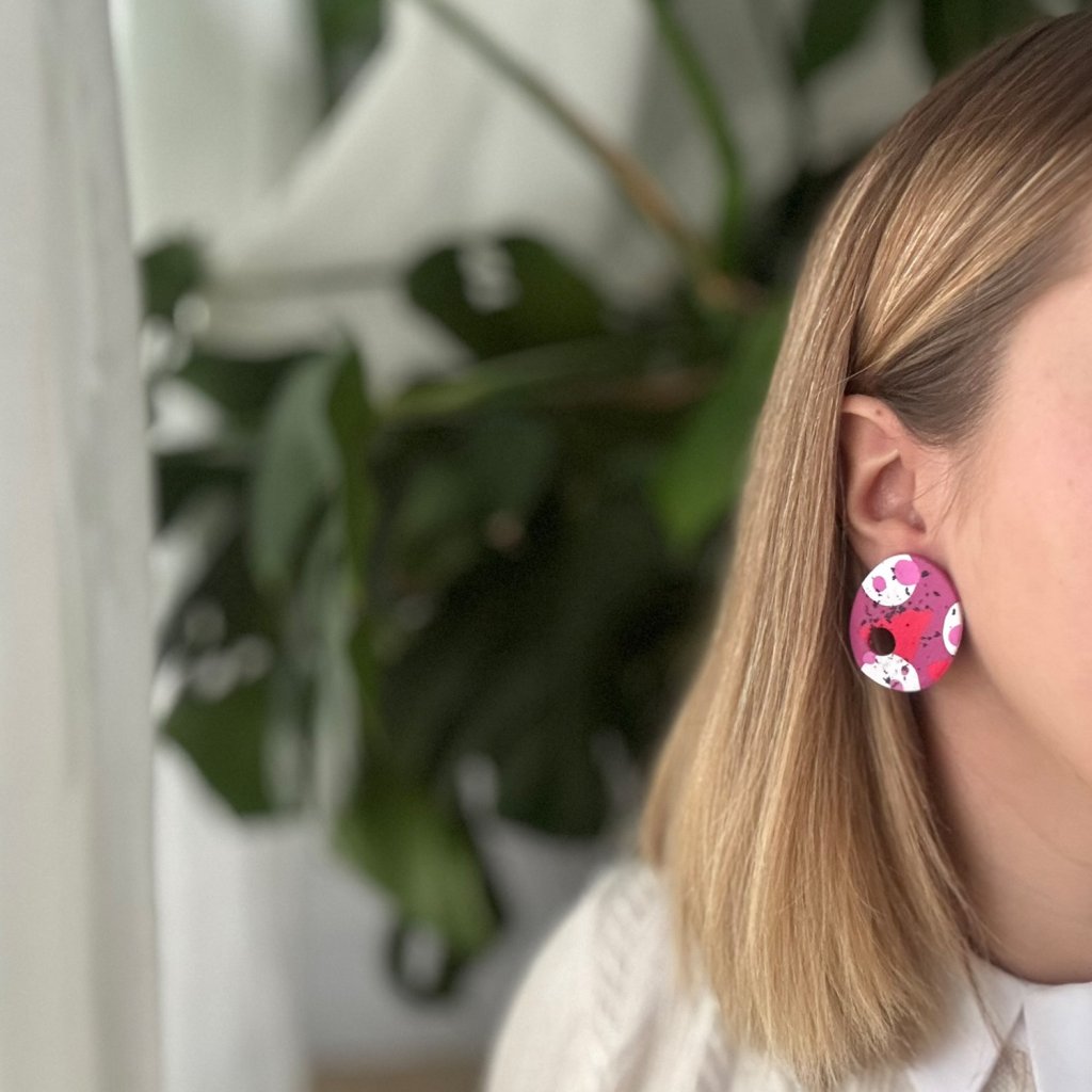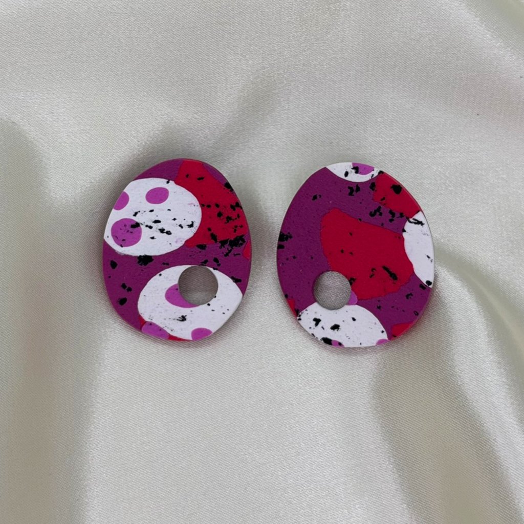 Náušnice z polymérovej hmoty, ktoré sú minimalistické no zároveň originálne. Oblý tvar pôsobí moderne a nadčasovo. Povrch je pokrytý abstraktným vzorom v intenzívnych farbách. Otvor v strede pridáva zaujímavý dizajnový prvok, ktorý ich robí unikátnymi a štýlovými.