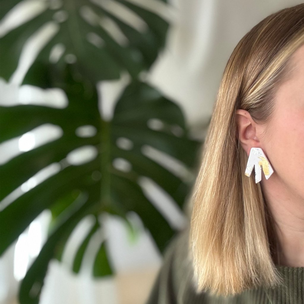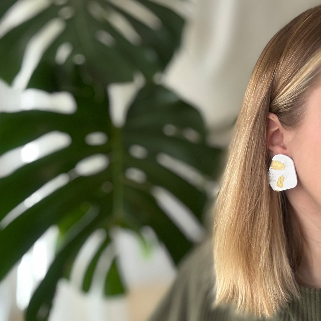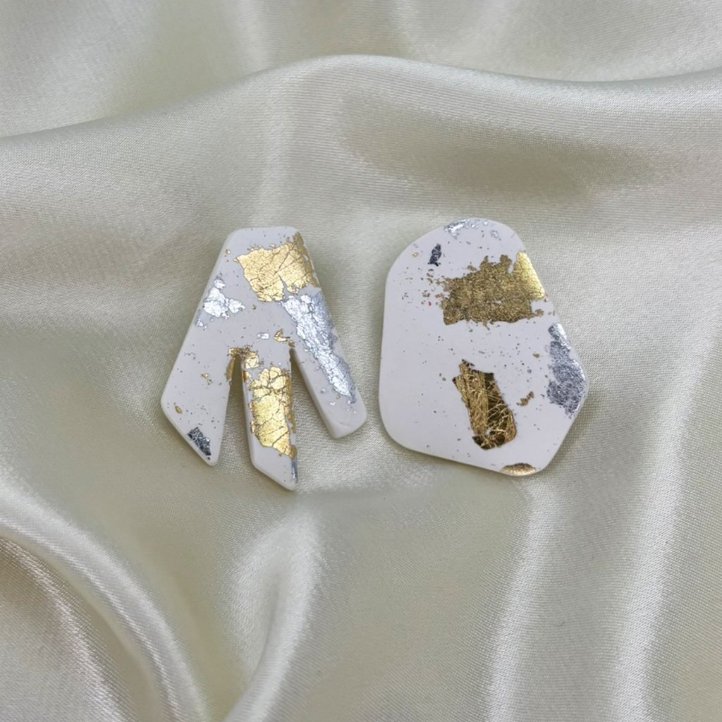 Náušnice z polymérovej hmoty majú minimalistický a geometrický dizajn. Jedna náušnica má asymetrický, organický tvar, zatiaľ čo druhá je výraznejšia výrezmi. V kombinácii so zlatými a striebornými plátkami vytvárajú elegantný dizajn.