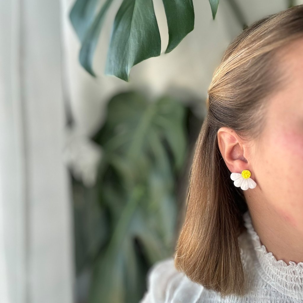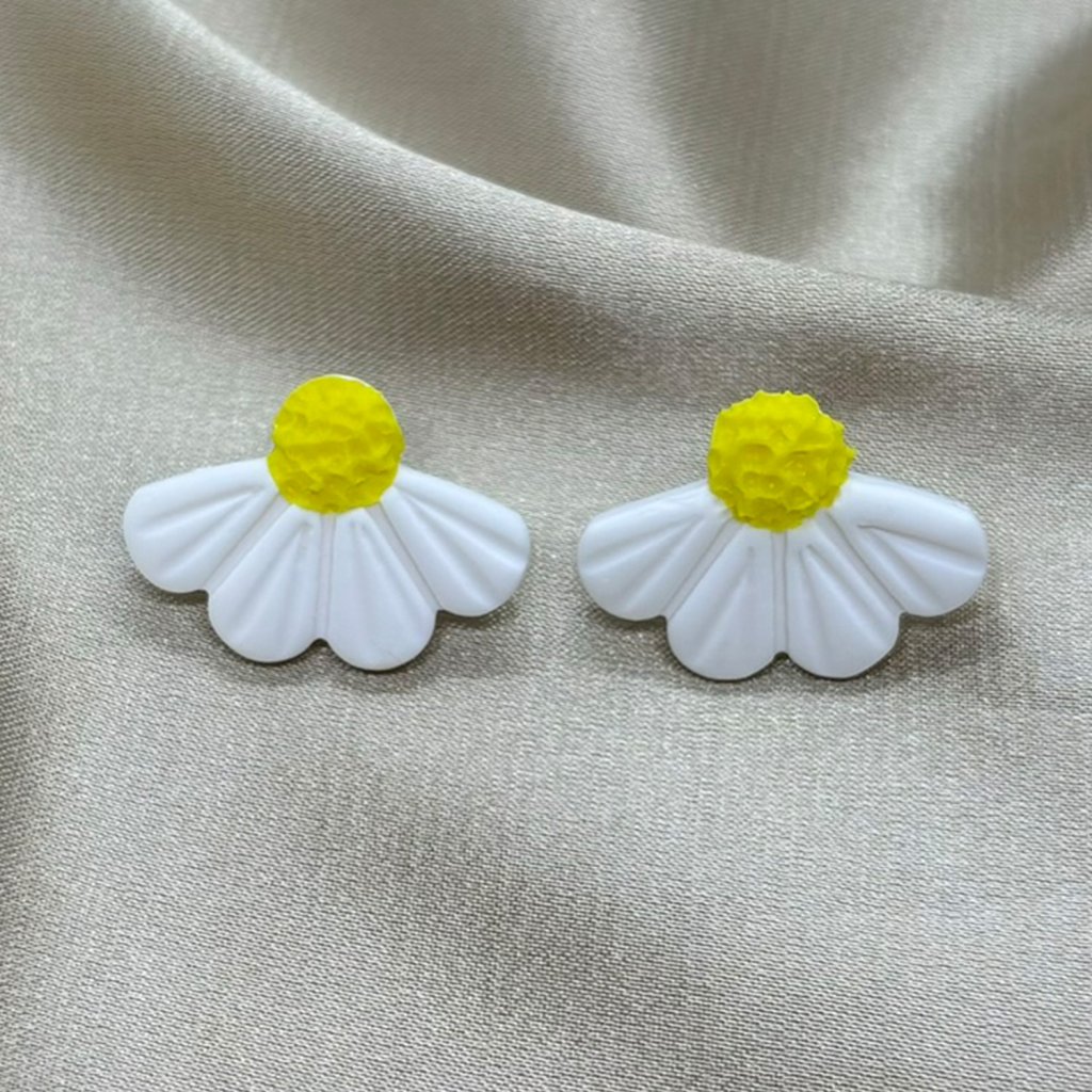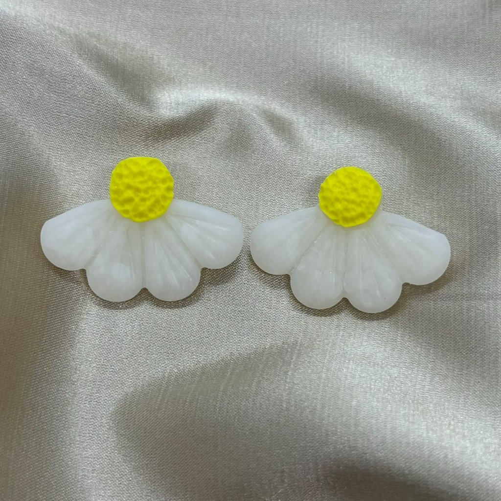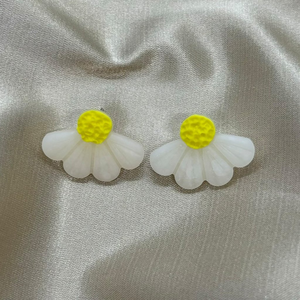 Náušnice majú jemný, kvetinový dizajn, ktorý pripomína sedmokrásku. Kombinácia bielej/transparentnej farby s textúrovaným žltým stredom vytvára svieži a hravý dojem, ktorý je ideálny na každodenné nosenie alebo na dodanie jemného ženského dotyku k outfitu.