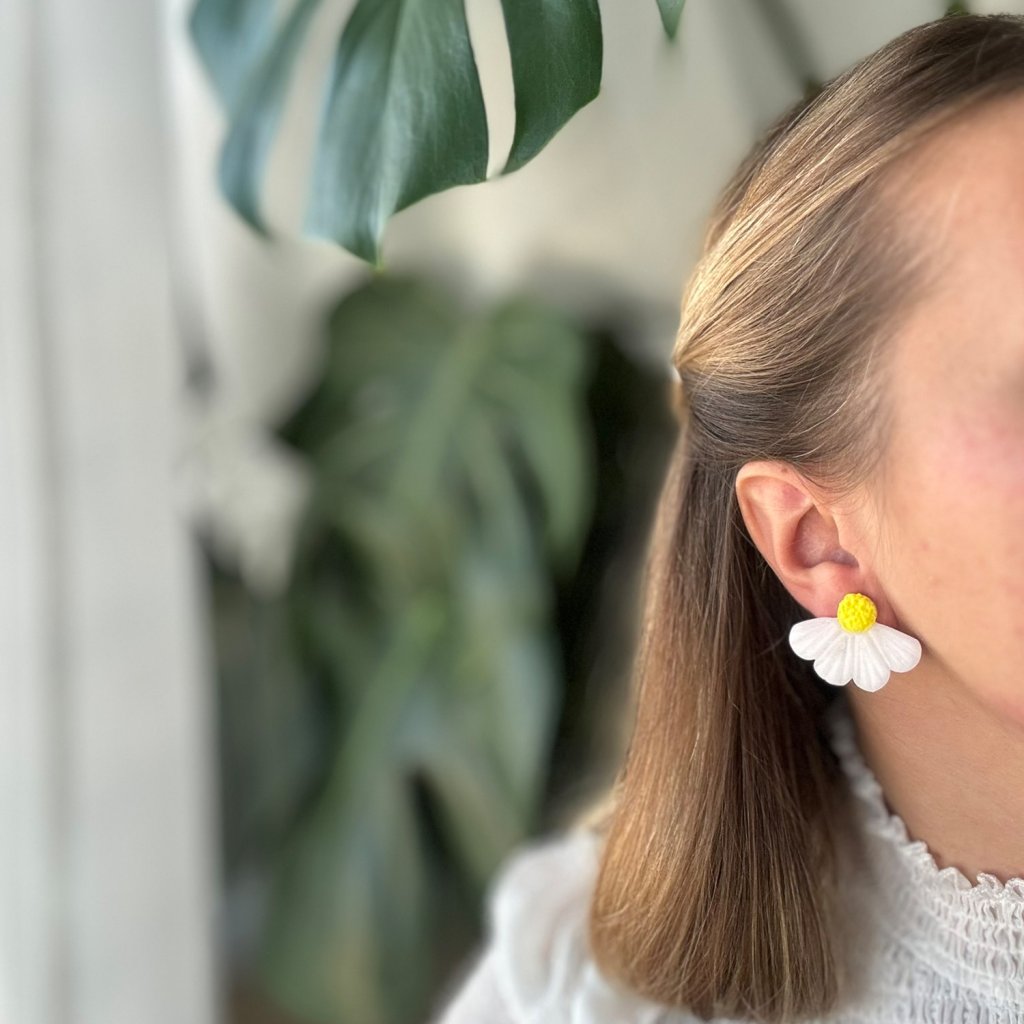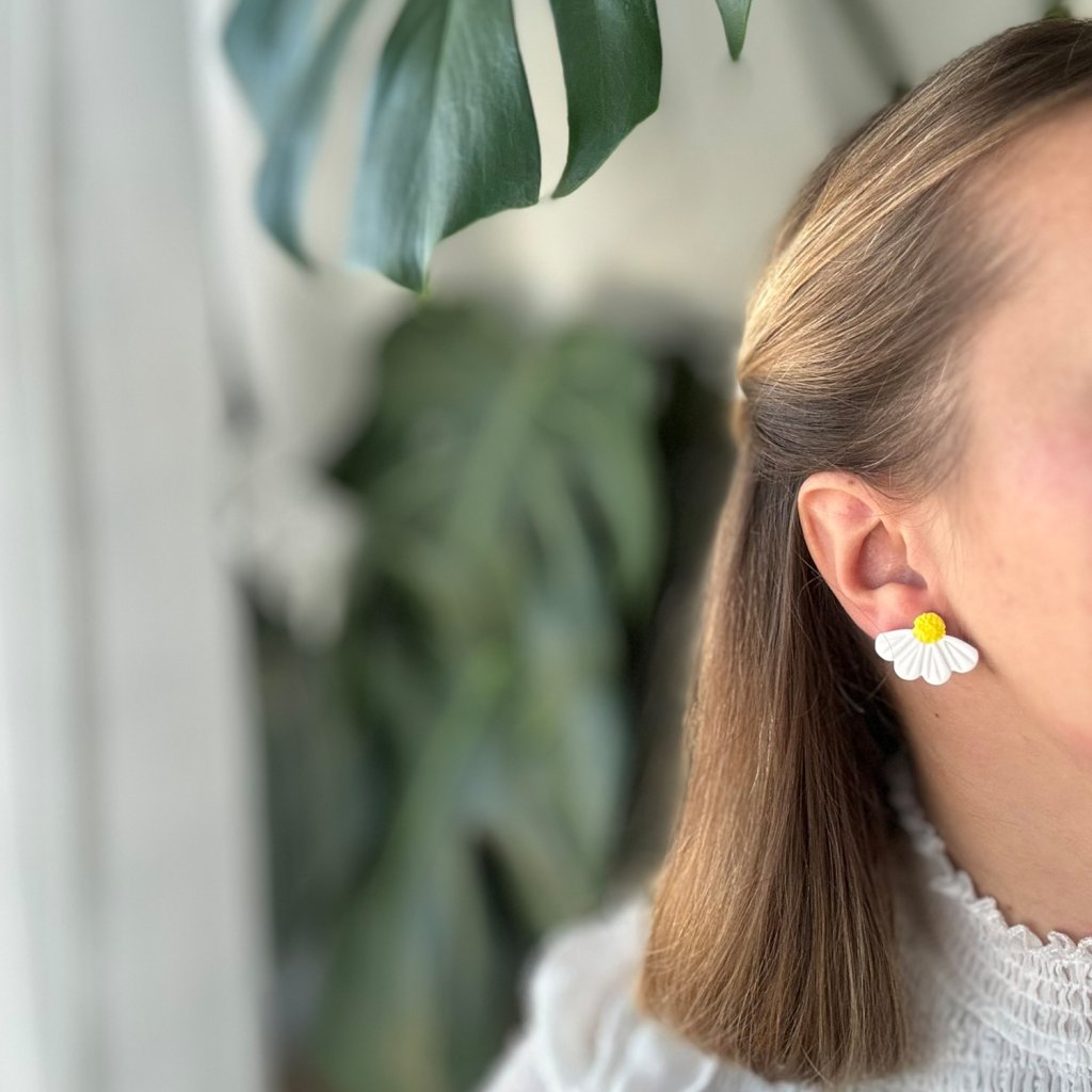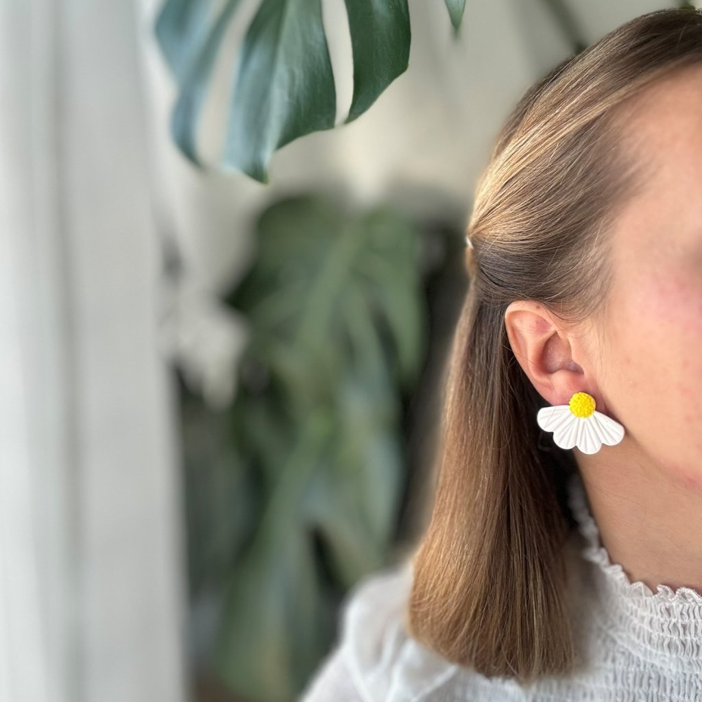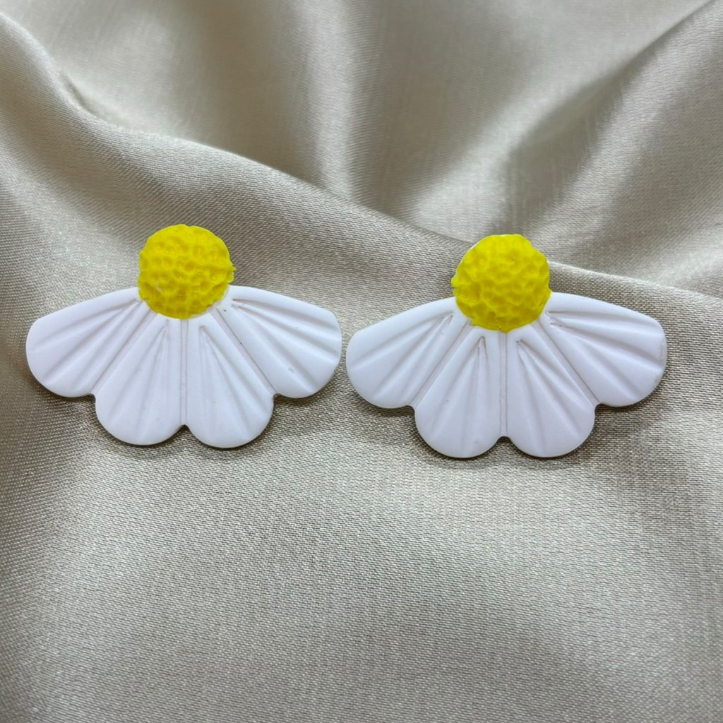 Náušnice majú jemný, kvetinový dizajn, ktorý pripomína sedmokrásku. Kombinácia bielej/transparentnej farby s textúrovaným žltým stredom vytvára svieži a hravý dojem, ktorý je ideálny na každodenné nosenie alebo na dodanie jemného ženského dotyku k outfitu.