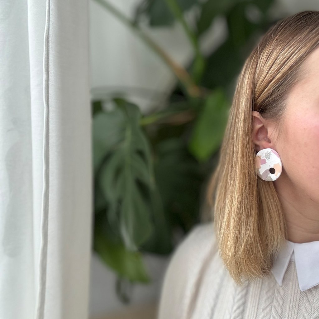 Náušnice z polymérovej hmoty, ktoré sú minimalistické no zároveň originálne. Oblý tvar pôsobí moderne a nadčasovo. Farebná kombinácia s lesklými striebornými akcentmi vytvára jemný, ale luxusný dojem. Otvor v strede pridáva zaujímavý dizajnový prvok, ktorý ich robí unikátnymi a štýlovými.