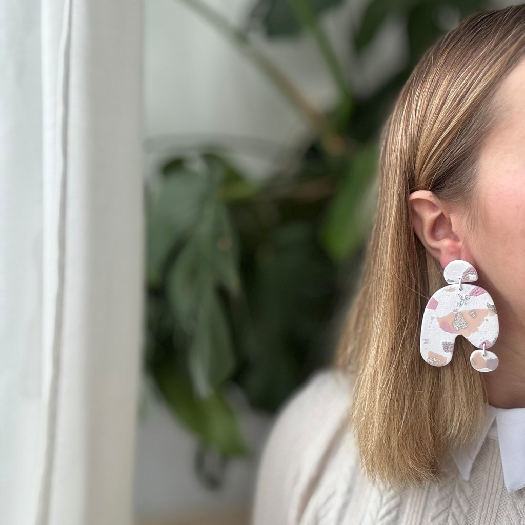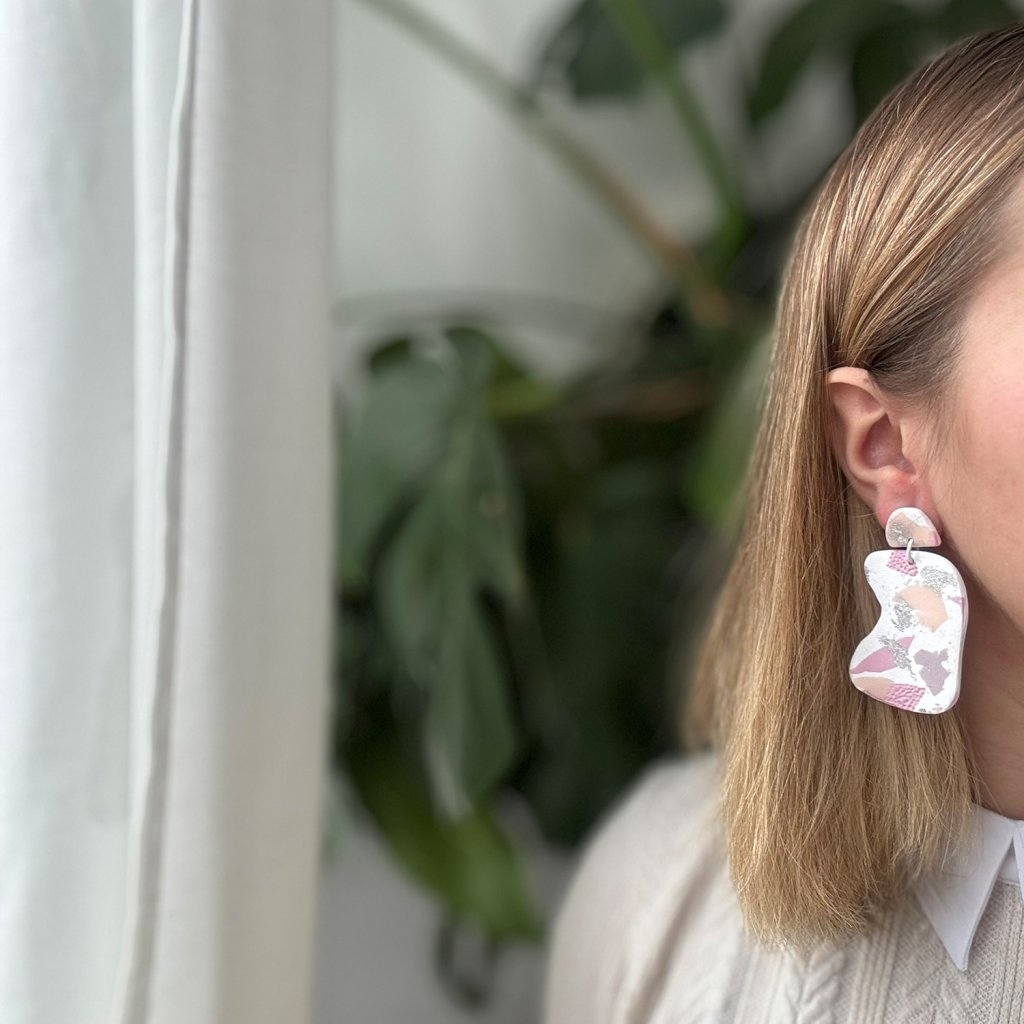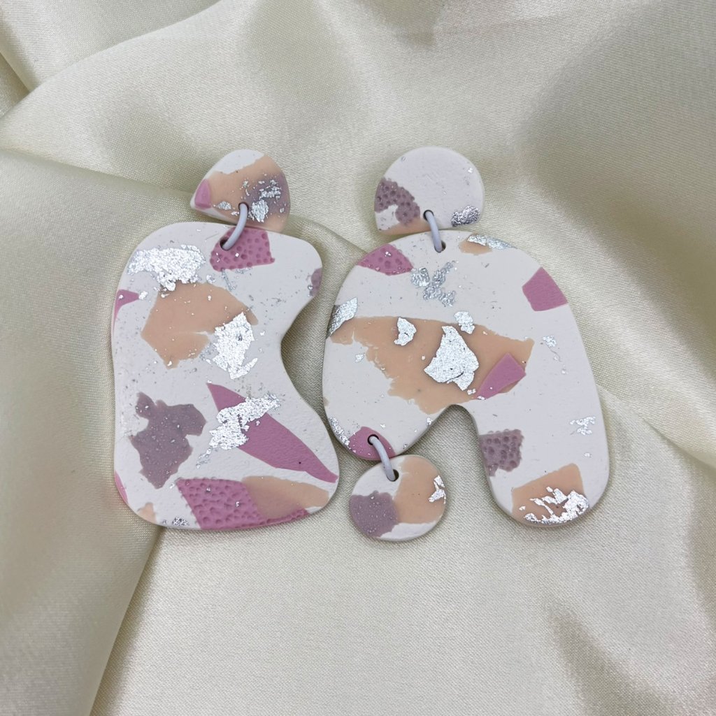 Náušnice z polymérovej hmoty sú originálne a moderné. Ich asymetrický tvar pridáva jedinečný a umelecký nádych. Farebná kombinácia s lesklými striebornými akcentmi vytvára jemný, ale luxusný dojem. Náušnice sú skvelé pre milovníkov jedinečných tvarov a vzorov.