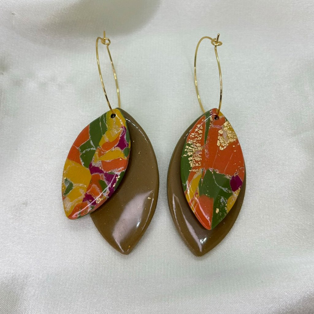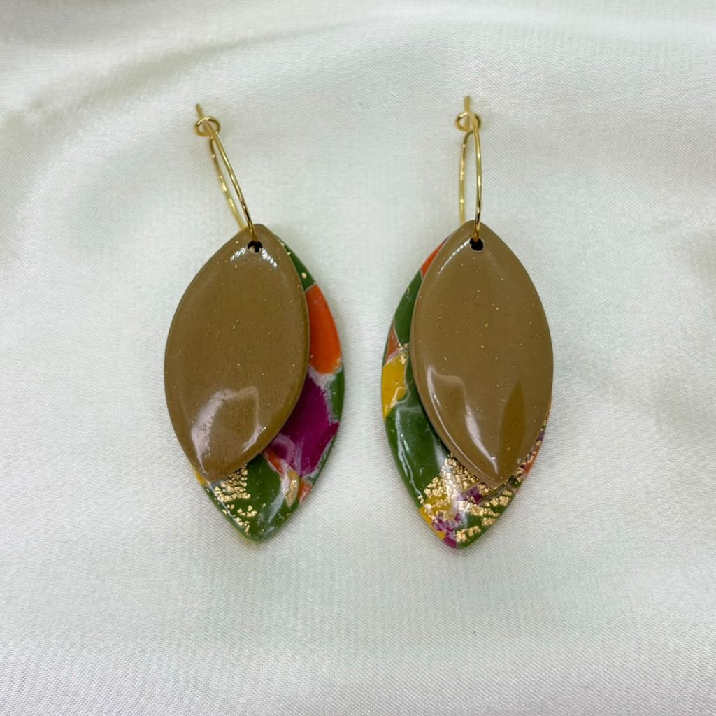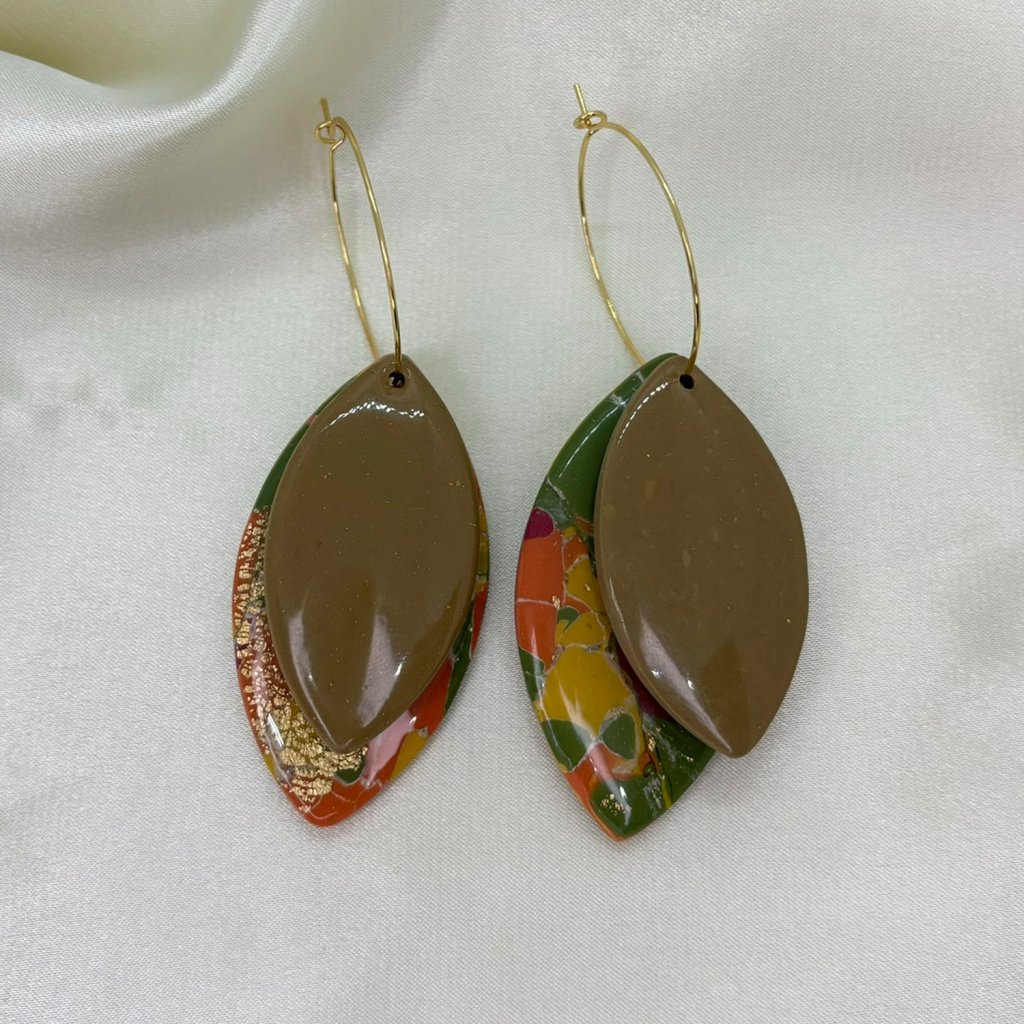Náušnice z polymérovej hmoty v jedinečnom dizajne. Oba listy, jeden farebný a druhý jednofarebný pôsobia harmonicky a elegantne. Zavesenie na zlatých kruhoch im dodáva nádych elegancie a robí ich modernými, no zároveň jemnými. Tieto náušnice skvelo doplnia jesenné outfity.