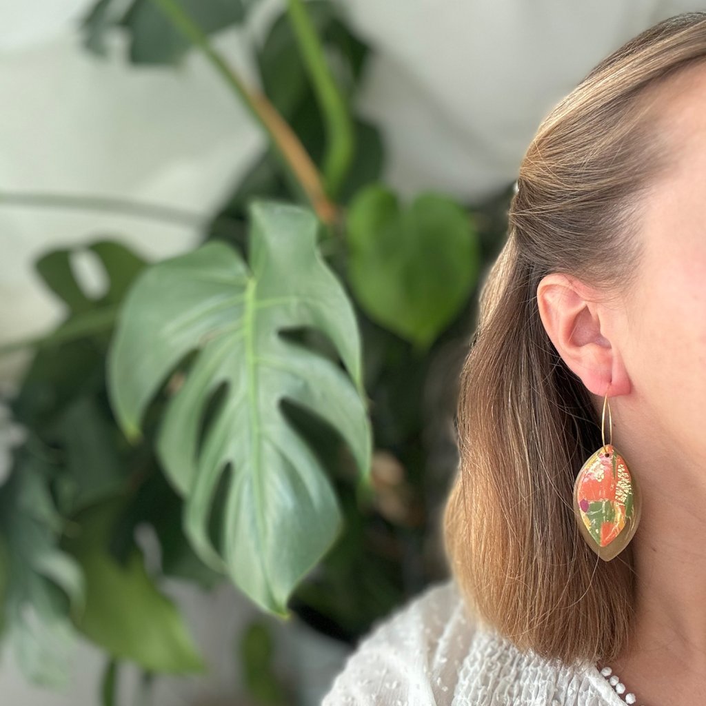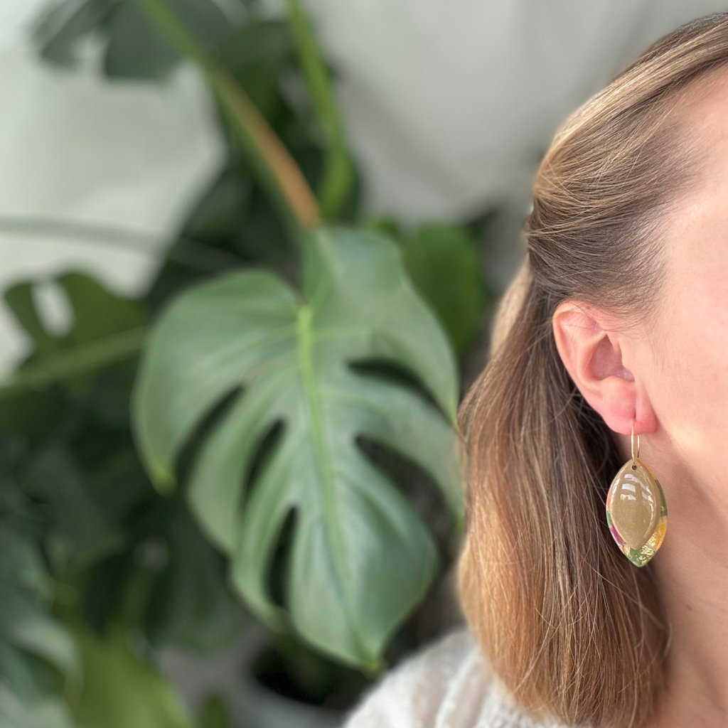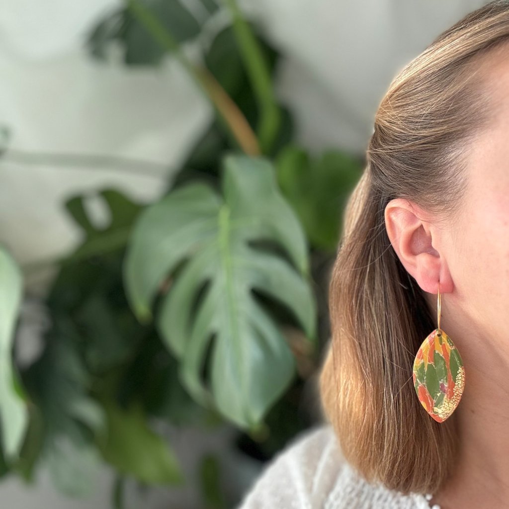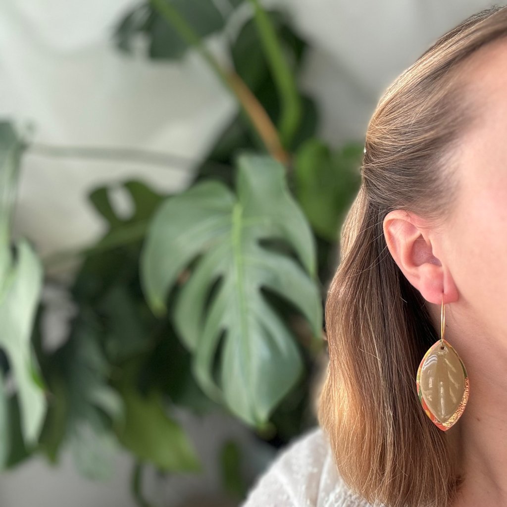 Náušnice z polymérovej hmoty v jedinečnom dizajne. Oba listy, jeden farebný a druhý jednofarebný pôsobia harmonicky a elegantne. Zavesenie na zlatých kruhoch im dodáva nádych elegancie a robí ich modernými, no zároveň jemnými. Tieto náušnice skvelo doplnia jesenné outfity.