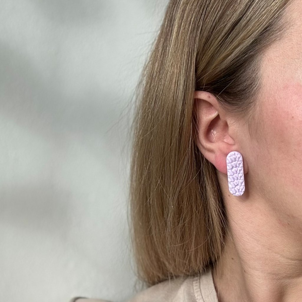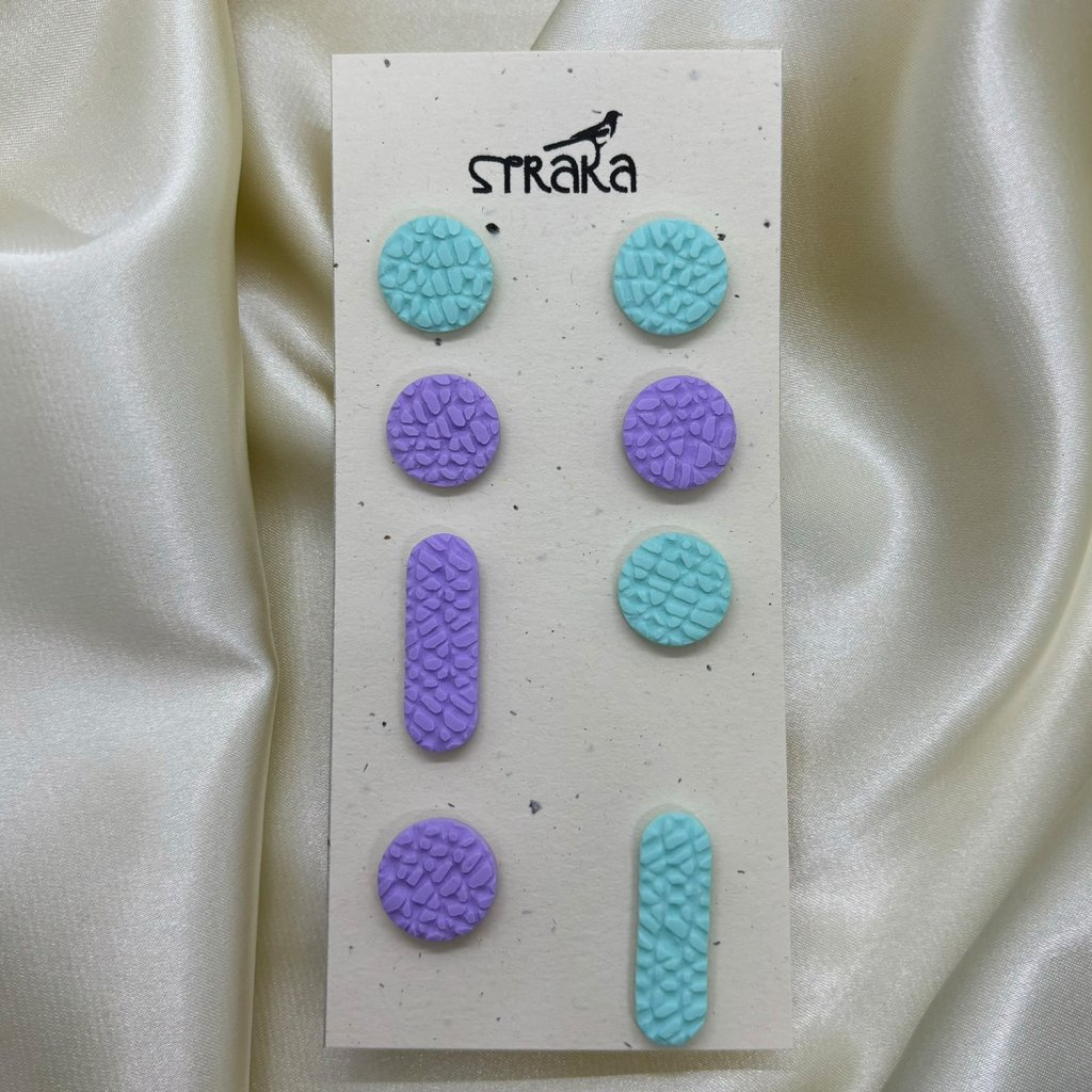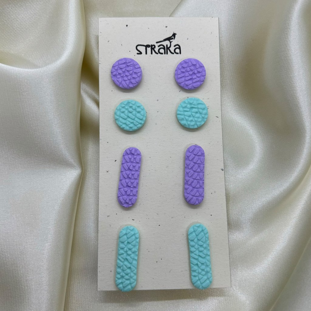 Set náušníc z polymérovej hmoty kombinuje jemné pastelové odtiene fialovej a tyrkysovej so štruktúrovaným povrchom, ktorý pripomína jemné reliéfne vzory. Dizajn je minimalistický a štýlový.