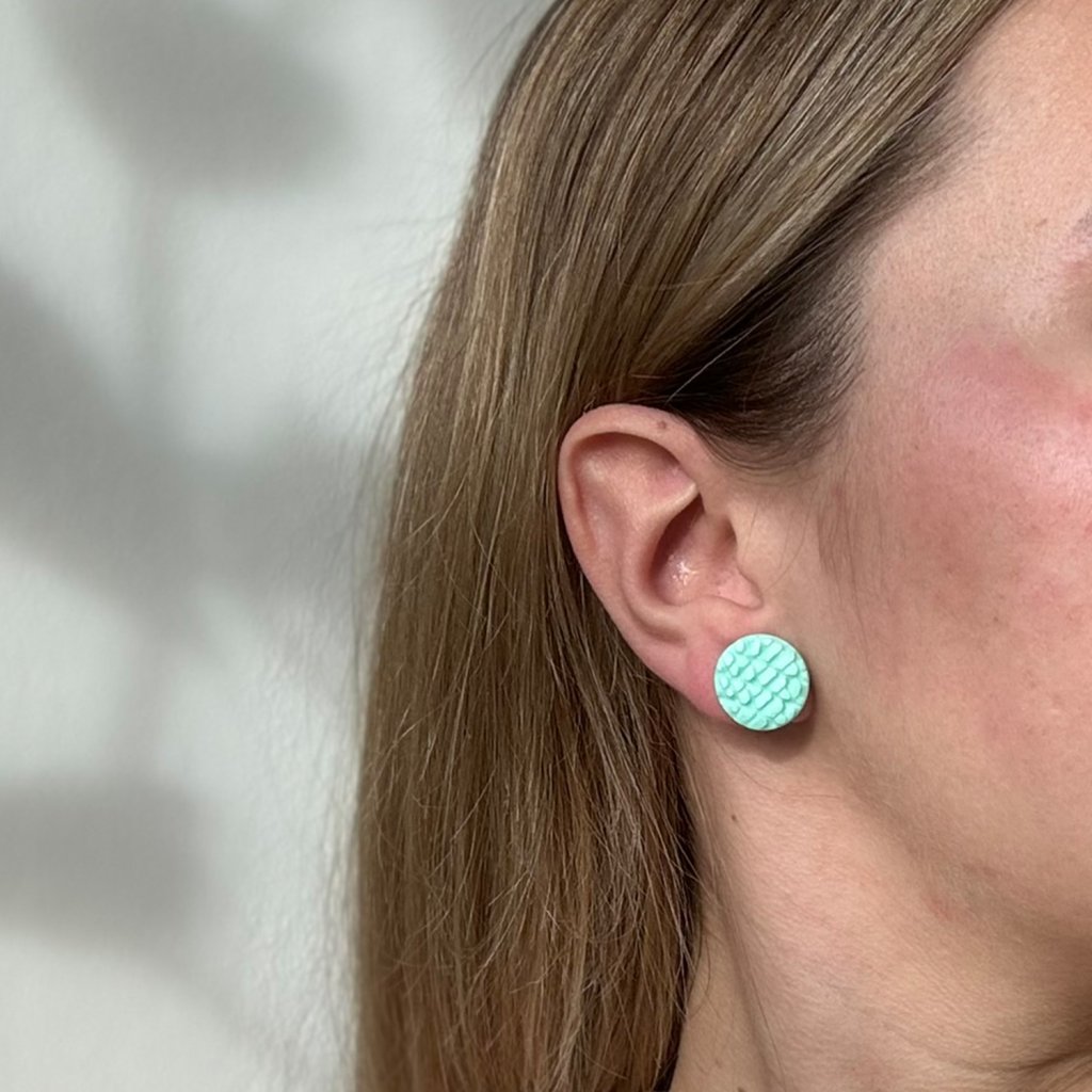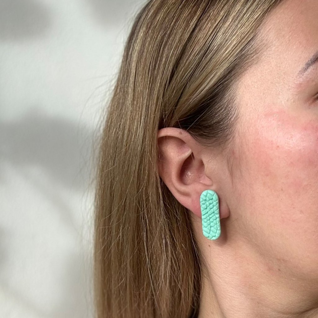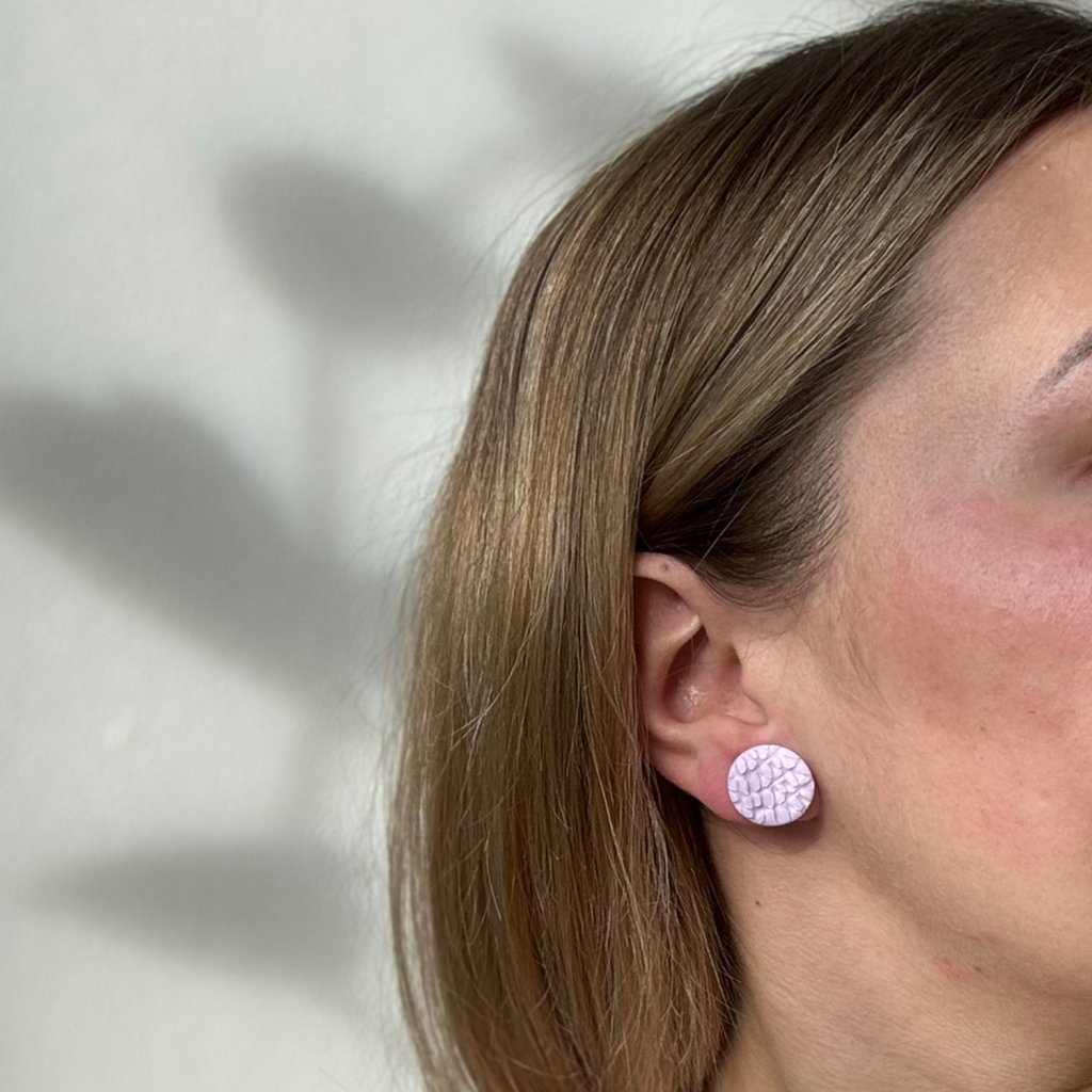 Set náušníc z polymérovej hmoty kombinuje jemné pastelové odtiene fialovej a tyrkysovej so štruktúrovaným povrchom, ktorý pripomína jemné reliéfne vzory. Dizajn je minimalistický a štýlový.