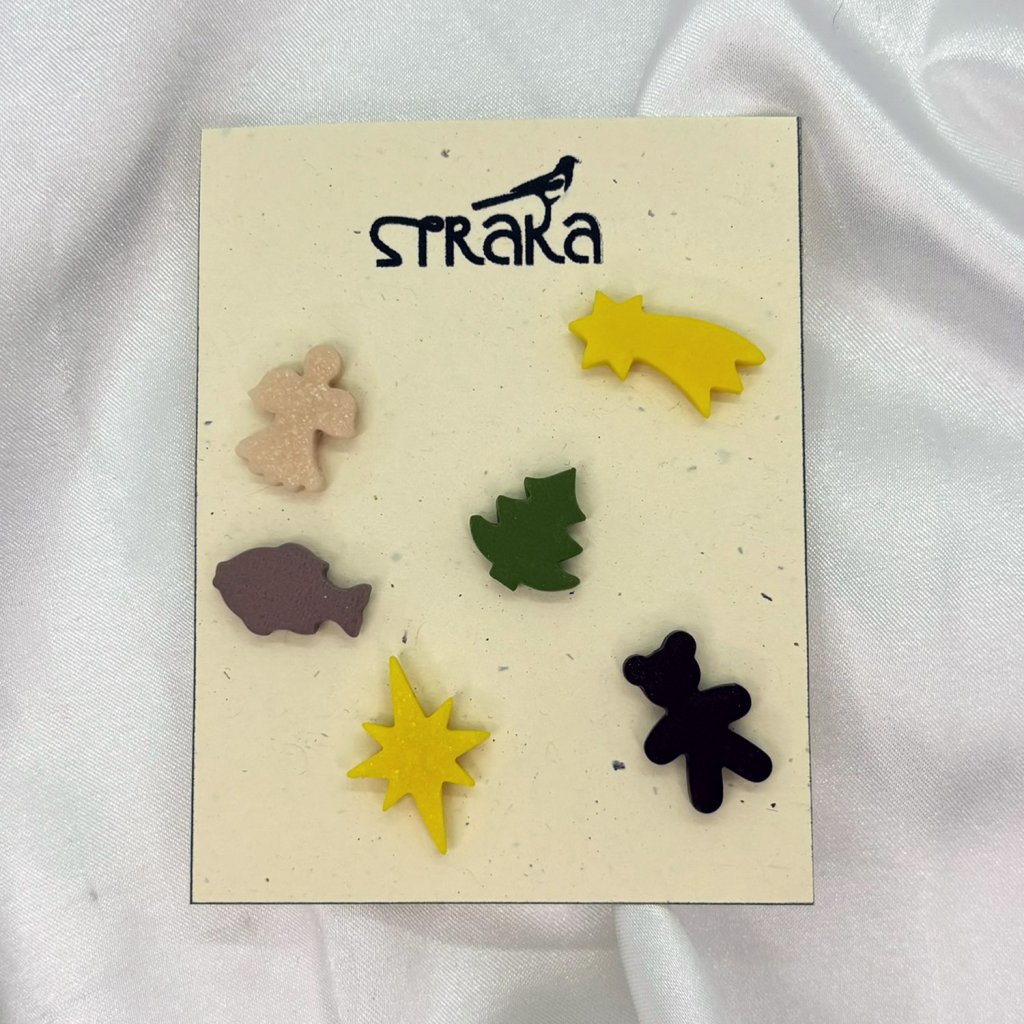 Set náušníc z polymérovej hmoty obsahuje šesť rôznych tvarov, ktoré sú tematicky spojené so sviatočným obdobím a prírodou. Každý kus je farebne odlíšený a možno ich medzi sebou kombinovať podľa vlastného štýlu.