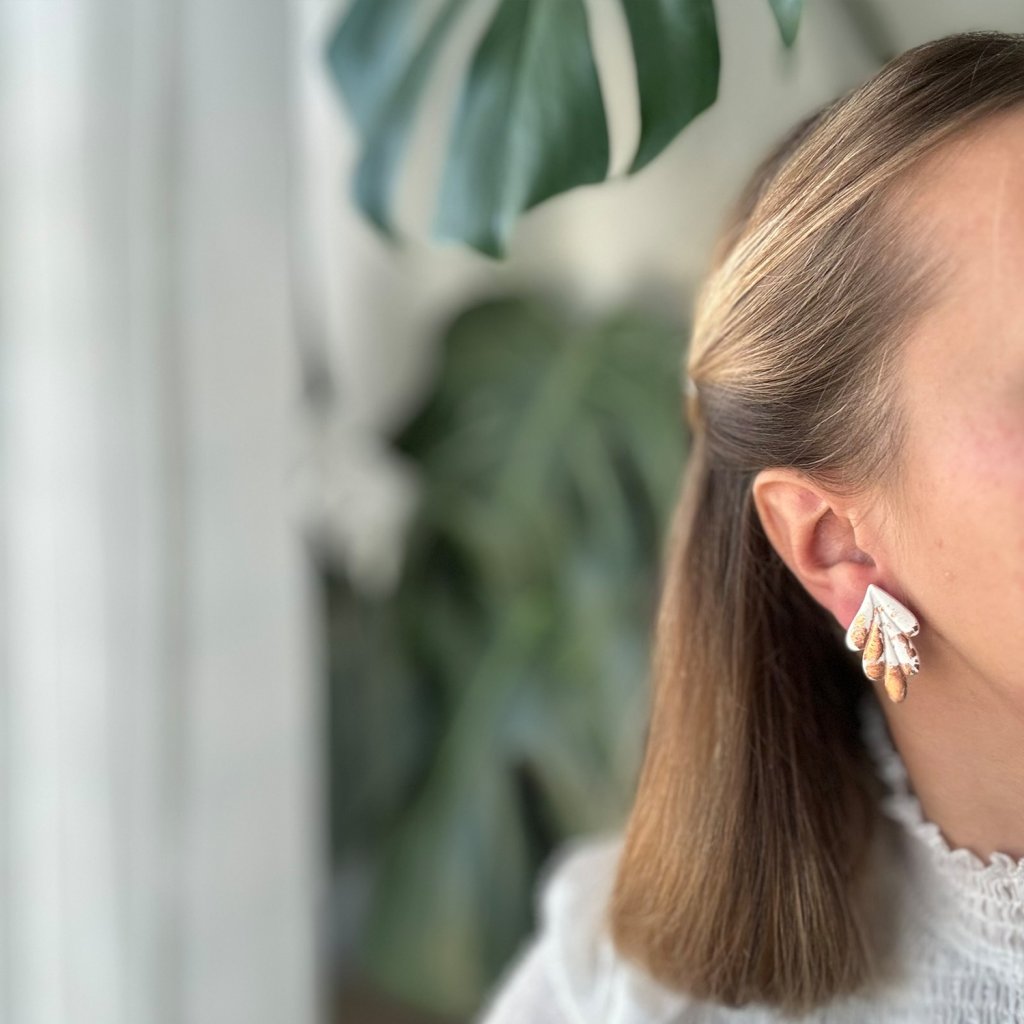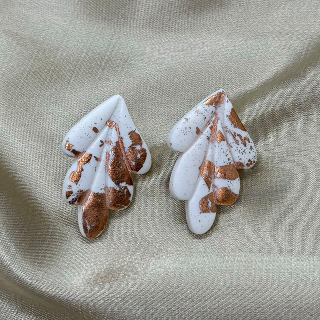 Náušnice z polymérovej hmoty, ktoré kombinujú moderný dizajn s abstraktnými prvkami v bielej farbe s rosegold škvrnami. Ich asymetrický tvar a prírodné tóny vytvárajú štýlový a zároveň nenápadný doplnok, ideálny pre minimalistický outfit.