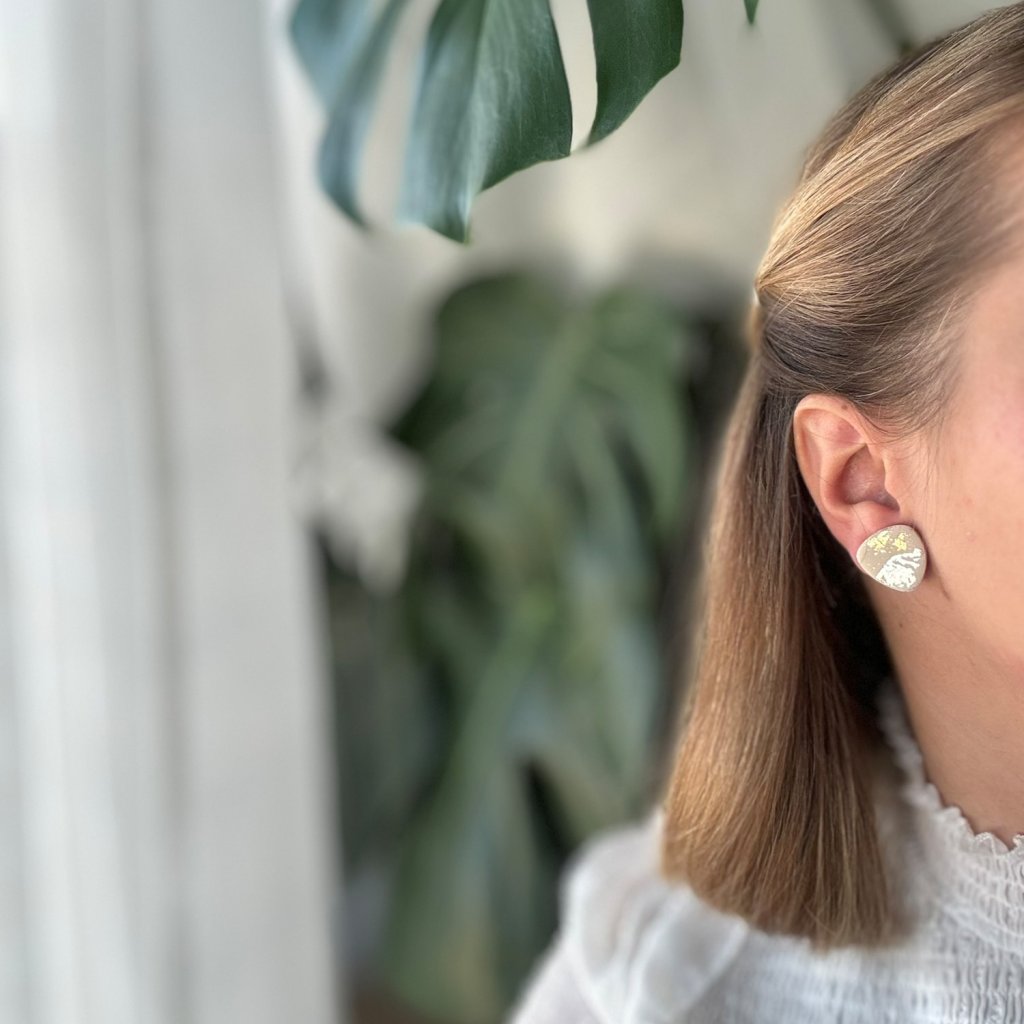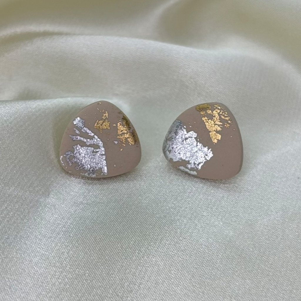 Náušnice majú jemný trojuholníkový tvar, ktorý im dodáva moderný vzhľad a metalické plátky im dodávajú nádych luxusu. V kombinácii s tlmeným neutrálnym odtieňom pôsobia veľmi elegantne a sofistikovane.